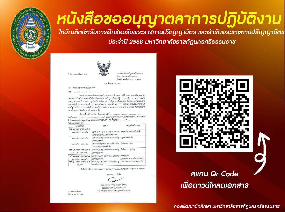 หนังสือขออนุญาตลาการปฏิบัติงาน ให้บัณฑิตเข้ารับการฝึกซ้อมรับพระราชทานปริญญาบัตร และเข้ารับพระราชทานปริญญาบัตร ประจำปี 2568 มหาวิทยาลัยราชภัฏนครศรีธรรมราช