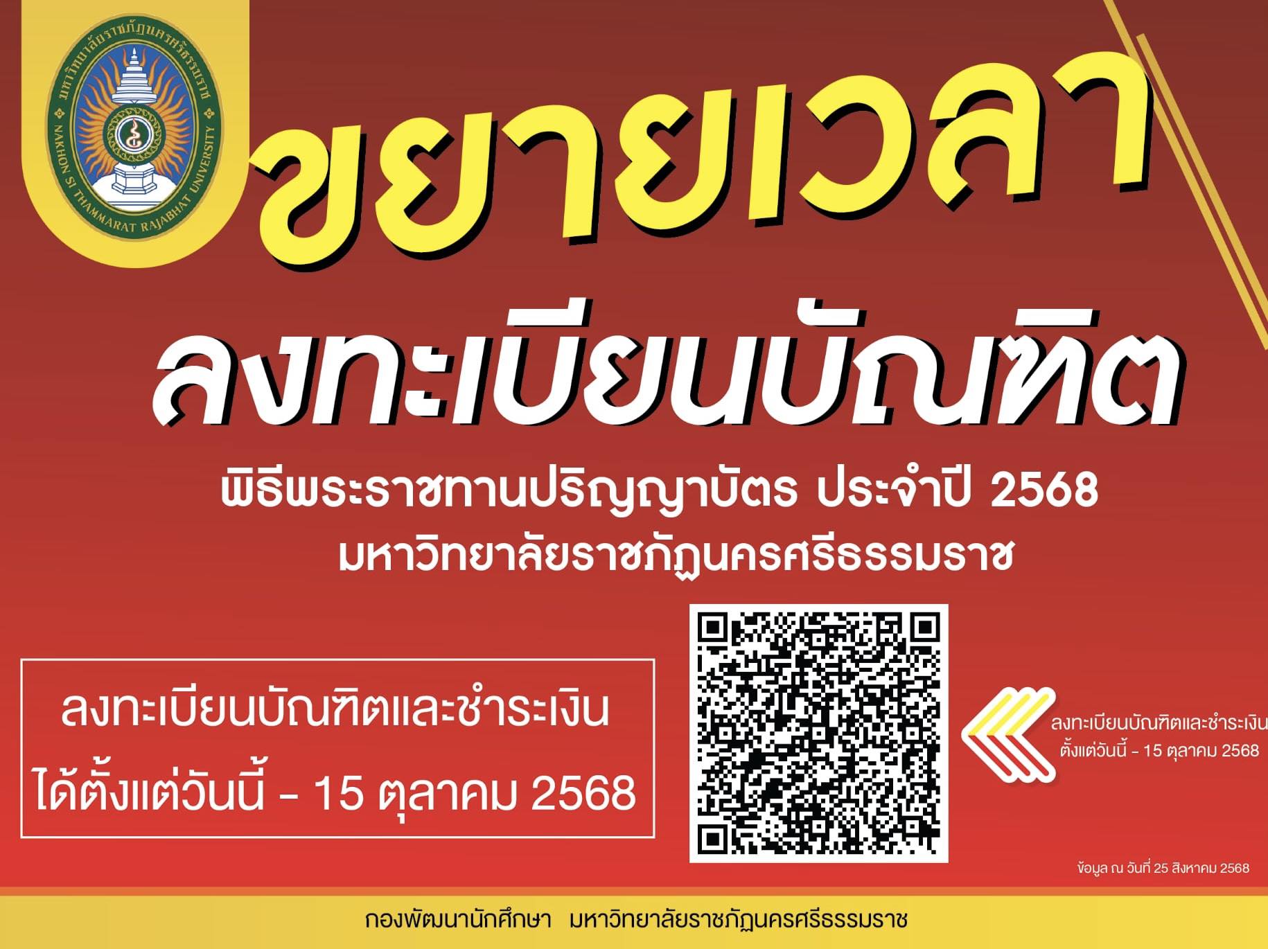 1. ขยายเวลาในการลงทะเบียนบัณฑิตและชำระค่าลงทะเบียนบัณฑิต เพื่อเข้ารับพระราชทานปริญญาบัตร ประจำปี 2568