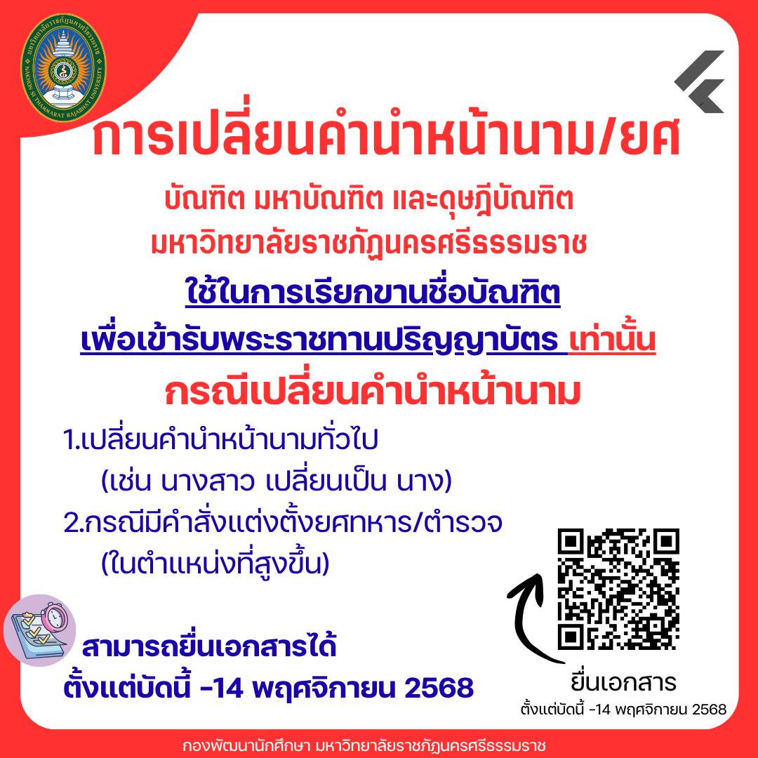 บัณฑิต มหาบัณฑิต และดุษฎีบัณฑิต มหาวิทยาลัยราชภัฏนครศรีธรรมราชที่ต้องการเปลี่ยน คำนำหน้านาม/ยศ เพื่อใช้ในการขานชื่อบัณฑิตเข้ารับพระราชทานปริญญาบัตร สามารถยื่นเอกสารได้ตั้งแต่บัดนี้ -14 พฤศจิกายน 2568